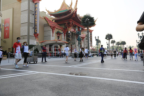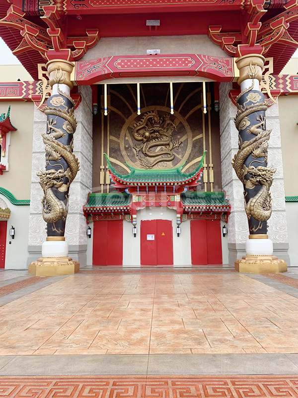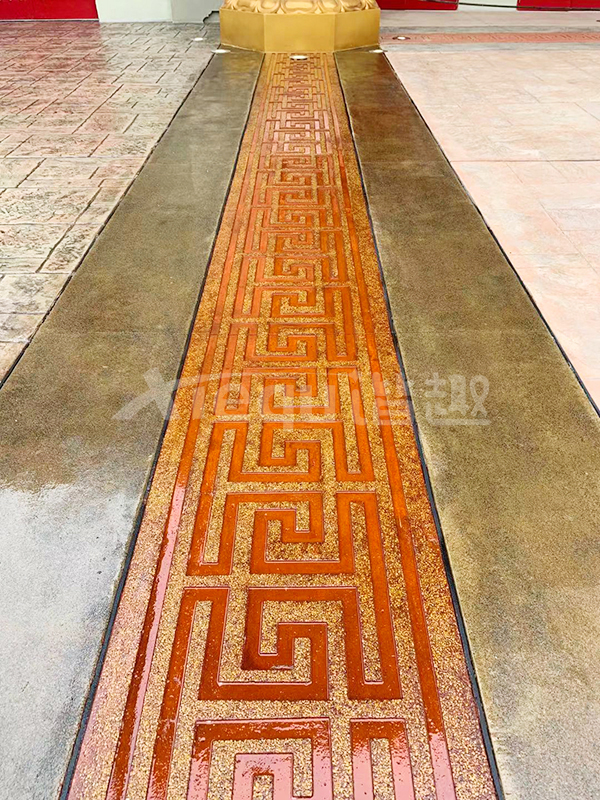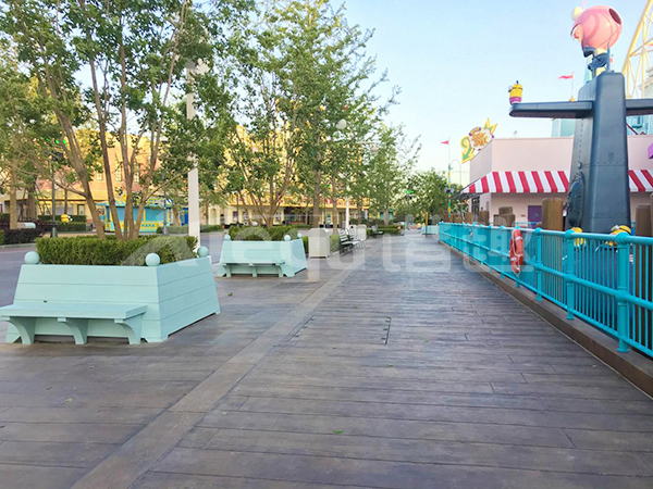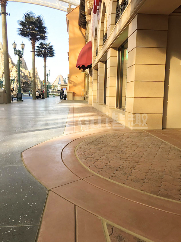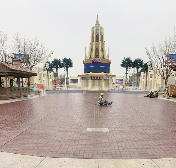 我司參與了北京環(huán)球影城好萊塢大道和小黃人兩個主題的路面鋪裝工作,鋪裝面積為2.4萬㎡。其中包含了彩色混凝土礫石面藝術(shù)地坪、彩色混凝土壓印藝術(shù)地坪、彩色混凝土洗砂面藝術(shù)地坪、彩色混凝土鹽巖面藝術(shù)地坪、彩色混凝土仿泥仿塵藝術(shù)地坪、整體現(xiàn)澆路牙、掃毛面、座椅墻、化學(xué)著色等鋪裝硬景。